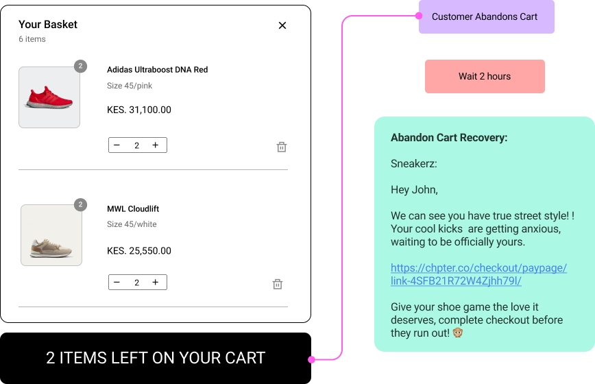 Engage Lost Shoppers 🛍️: Reconnect with customers who've left items in their cart, reminding them of what they're missing out on.Optimized Checkout Flow 📲: Designed to simplify and entice users back to complete their purchases, reducing lost revenue.